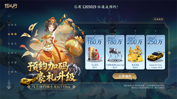即日起达成250万预约里程碑,可解锁【小米SU7 Ultra一年使用权】及飞天茅台等百万豪礼,5 月 16 日将通过直播抽奖形式,面向全网所有预约玩家账号开奖并派发,预约即有机会成为天选锦鲤!