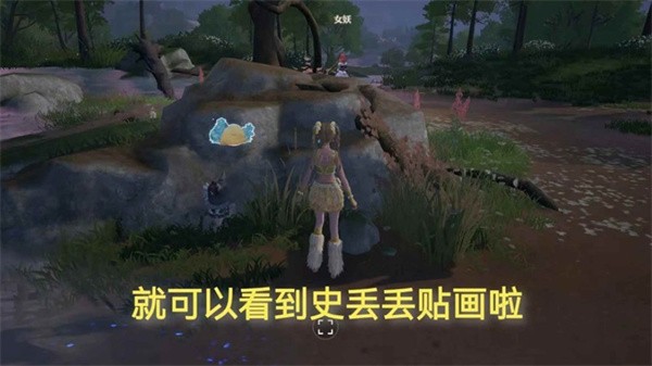 5、到达女妖站立区域后,在湖泊中间靠近的一棵树下方,找到大石块附近即可发现“丢丢也典雅”的贴纸。