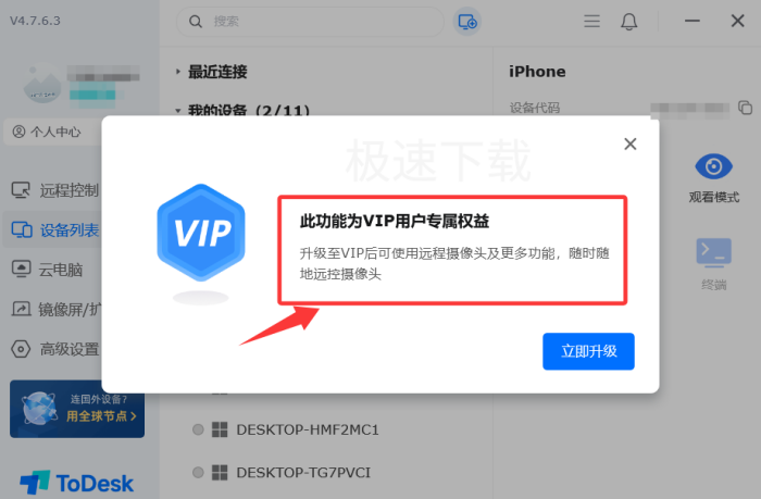 经过极速下载软件通实际使用,发现要开启摄像头功能,就需要开通ToDesk的VIP服务升级为专业版。