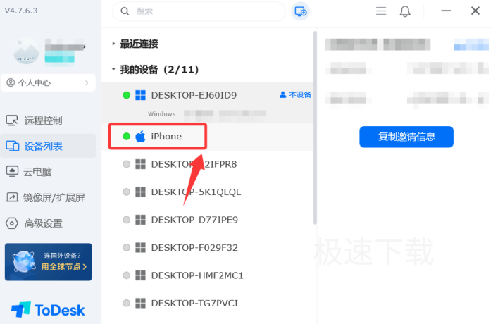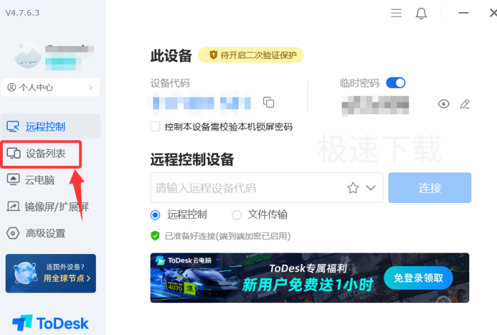 3.打开ToDesk,点击左侧的【设备列表】;