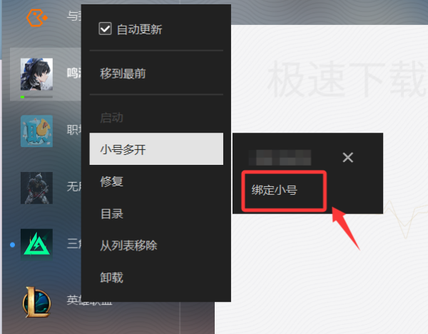 极速下载游戏通体验过后发现,WeGame支持绑定多个小号,右键英雄联盟,点击小号多开,就能看到在已经绑定一个小号的前提下,还可以继续绑定小号,极大方便了多账号用户,无需再反复重新登录WeGame。