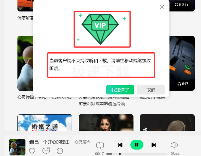极速下载软件通体验后,发现听书内容无需收费,但是要收听高音质内容会提示需要前往移动端,并且需要VIP会员服务。