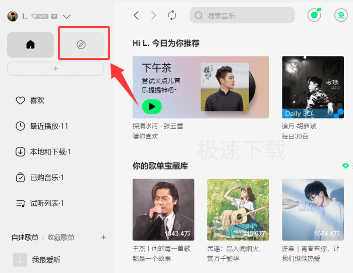 1.打开QQ音乐,点击左上角的【乐馆】;