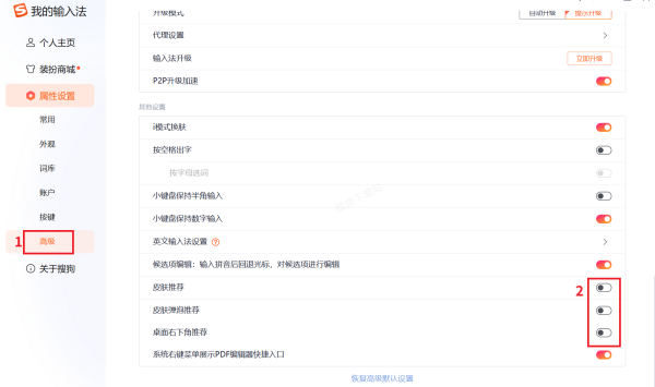 3.在左侧找到【高级】,右边最下方将【皮肤推荐】、【皮肤弹泡推荐】、【桌面右下角推荐】全部关闭,这样搜狗输入法就不会弹出桌面广告了。