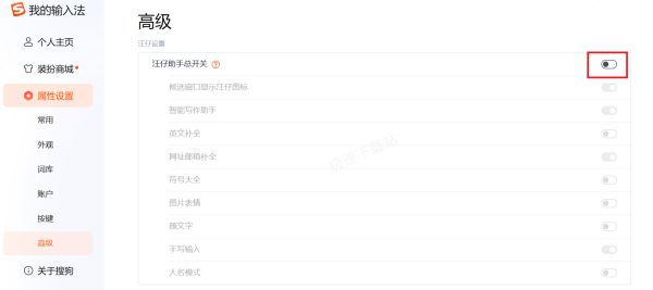 1.在搜狗输入法的【更多设置】中,点击左侧【高级】,将右侧第一行【旺仔助手总开关】关闭,这样所有的AI功能都会停用了。