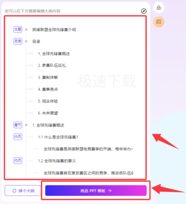 8.用户可以在输入框内修改Ai生成的大纲,确认没问题后点击【挑选PPT模板】;