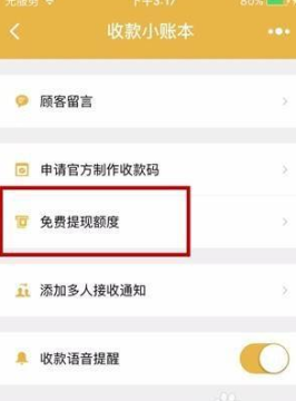 3、跳转页面后,点击二维码下方的“收款小账本”小程序。就会多出了一个“免费提现额度”选项,具体提额方法一般是收取多少费用就会提额多少,所以完全不用担心提现会要手续费了。