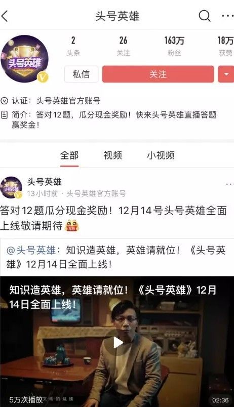 头号英雄答题是西瓜视频推出的一个答题赢现金的活动,答对12题就可以瓜分现金奖励,12月14号上线。