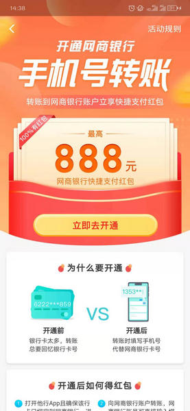 活动时间是从12月10号开始的,红包数量有限,先到先得,每一天可以享受一次参与的机会,只要使用银行app向网商银行手机号转账成功就可以得到红包一个,每天都可以得到红包,小伙伴赶紧来试试吧!