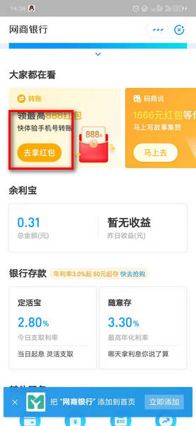 2、在网上银行界面的大家都在看栏目,在这里找到去拿红包,如下图所示;