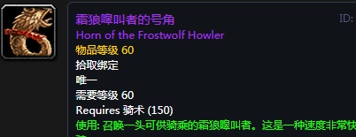 霜狼嗥叫者的号角:坐骑,使用召唤一头可供骑乘的霜狼嗥叫者,这是一种速度非常快的坐骑。