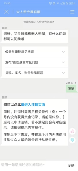 2、在与客服的界面输入注销发送就会出现注销的链接;