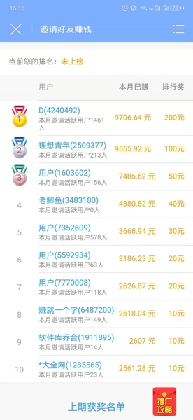 想要赚钱快的话目前来说推广更多的活跃用户做任务才是更加快速赚钱的门路哦,至于怎么去推广,每个人也有着不同的方法,使用众人帮的用户可以看到每个人的邀请好友赚钱的排行榜,小编仔细的看来下,前几名邀请好友赚钱的榜单基本上都是一样的人,同时他们自己没有做啥任务,都是单纯的靠拉好友来赚钱,上个月的榜单首位都赚了两万多,这个是官方的邀请补贴。