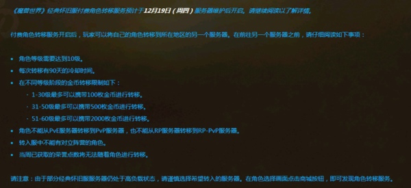 请注意:由于部分经典怀旧服服务器仍处于高负载状态,请谨慎选择希望转入的服务器。在角色选择画面点击商城按钮,即可发现角色转移服务。