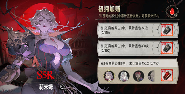 1、在「苍裔的苏生」累计宣告150次时,可从道具「夜眷棺枢」中自选一位不含始祖势力的SSR眷属。