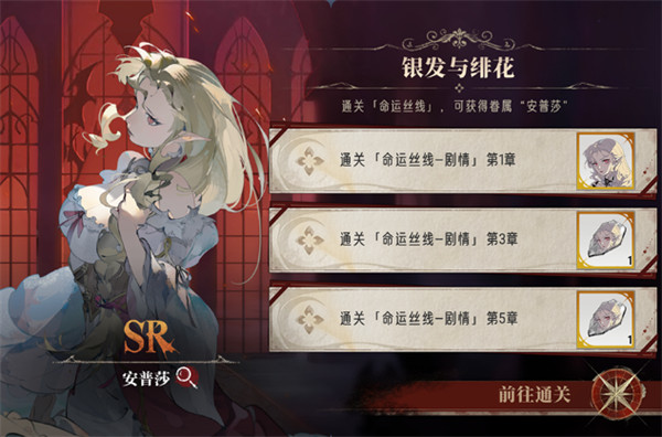 通关主线命运丝线第1章,即可获得SR眷属「安普莎」,通关第5章累计可领取【安普莎的灵魄x2】。