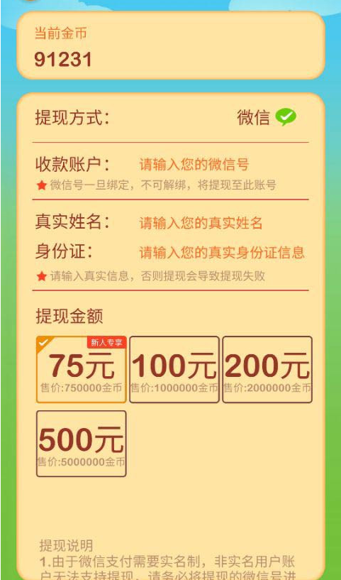 4、最后填写正确信息,并且金币数量达到提现要求就可以提现了。