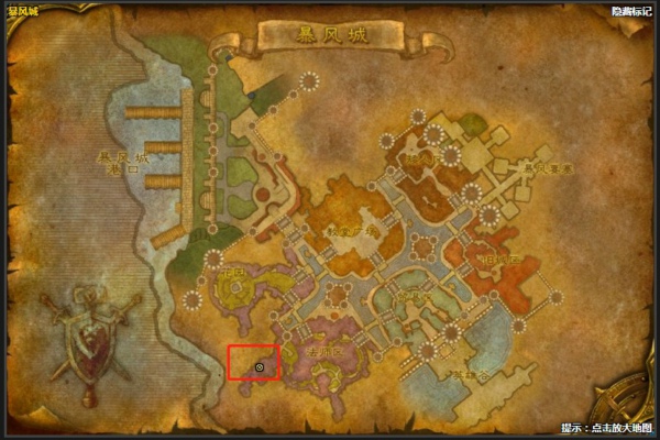 在暴风城法师区,如上图所示之中,坐标39.1,84.4的位置。