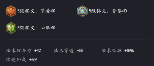 铭文推荐:10个梦魇(红色铭文),10个心眼(绿色铭文),10个贪婪(蓝色铭文)。