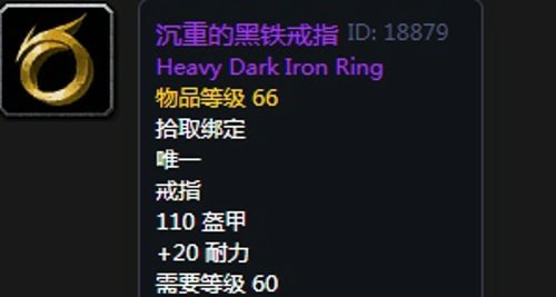 16、沉重的黑铁戒指:戒指2,熔火之心副本萨弗隆先驱者,鲁西弗隆,基赫纳斯,沙斯拉尔均可掉落,无法附魔。