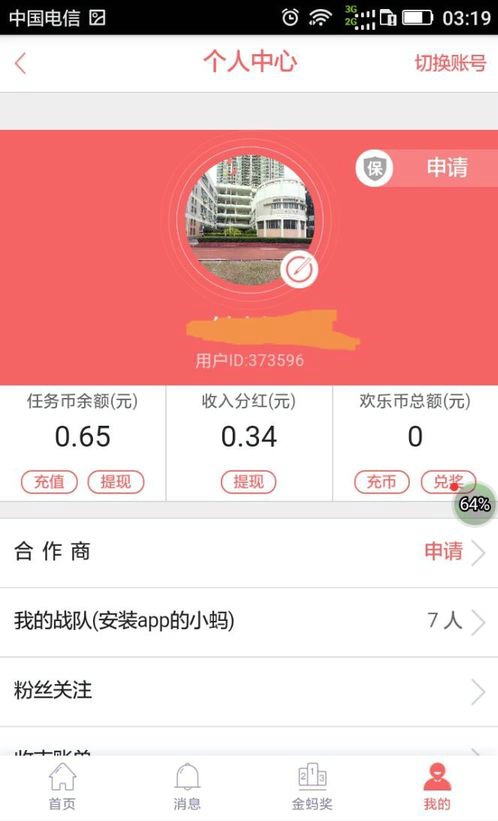 4.在主页面点击图标(个人中心)进入下个页面,可查看相关钱包明细。如:任务币余额、收入分红、欢乐币总额。需要提现或者充值直接点击余额下方标示即可完成。