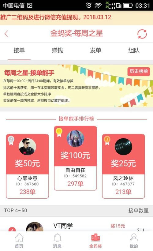 5.在主页面最下方可点击倒数第二个标示(金蚂奖),进入金蚂奖每周之星了解相关排行榜,每周接单前十名都有相关红包奖励。