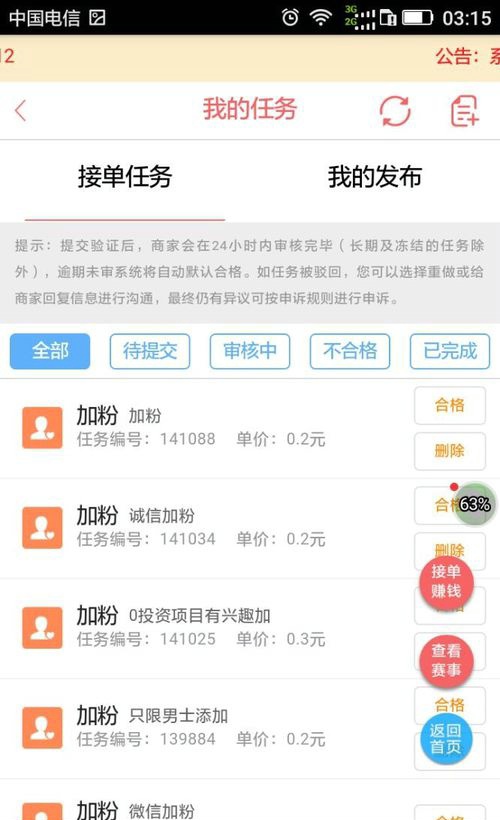 3.在主页面点击标题(我的任务)可以查看自己的接单任务情况,如待提交、审核中、不合格、已完成的相关问题,当任务通过完成后相关报酬会直接到个人钱包。