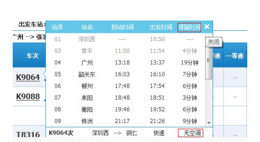 5、 可以看见会有列车的详细信息出来,在右下角有提示是否有空调,这列K9064就是没有空调的绿皮车,同时也能看见火车在各个站点的停留时间。