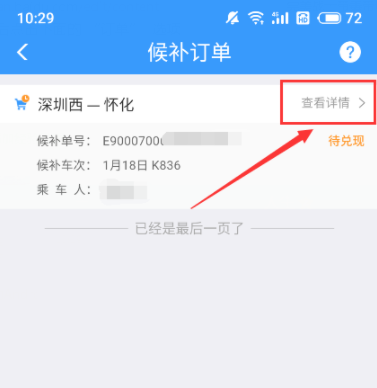 进入 “候补订单” 界面后点击右上方的 查看详情