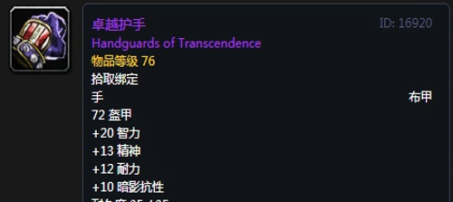 基础属性:72护甲,+20智力,+12耐力,+13精神,+10暗影抗性,装备效果使你的法术造成爆击的几率提高1%,提高法术所造成的治疗效果,最多29点。