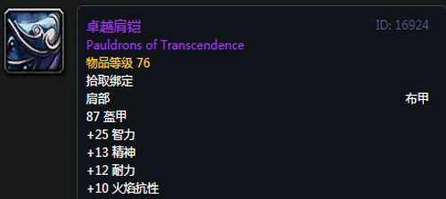 基础属性:65护甲,+26智力,+14耐力,+9精神,+10暗影抗性,装备效果提高法术所造成的治疗效果,最多26点。