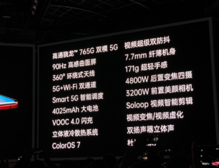 得益于多方面的控制,OPPO Reno3 Pro重量大幅减轻,在拥有6.5英寸屏幕,4025mAh电池的前提下,重量仅为171克,机身厚度仅为7.7mm。在2019年的6.5英寸左右手机中,重量非常轻。提升了用户在握持使用的手感。