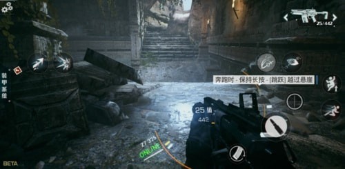 玩家首先要知道怎么奔跑,奔跑操作就是长按方向键,嗯,简单来说就是方向键一直前进就可以变成大众知道的动作,枪械不在是对准敌人,而是贴着身子的动作,这个就是奔跑模式,不是想和平精英那样,有一个奔跑的图标可以提示玩家。