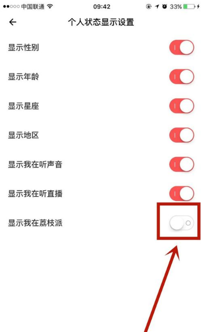 4、然后找到“显示我在荔枝派”,点击关闭右边的开关即可!