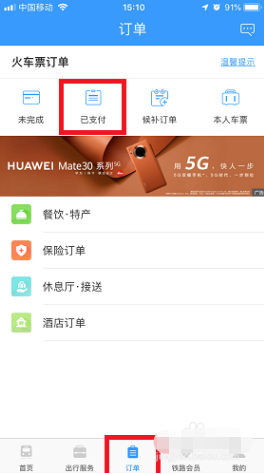 2、然后点击页面上的“订单”页面,在订单页面上点击打开上面的“已支付”。