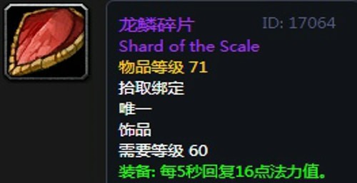 龙鳞碎片:饰品2,出自奥妮克希亚掉落,无法附魔。