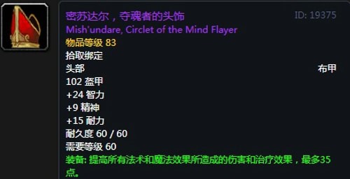 基础属性:103护甲,+12智力,+12耐力,+24精神,装备效果 提高法术所造成的治疗效果,最多77点,使你的法术造成爆击的几率提高1%。