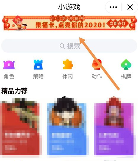 4、进入到“小游戏”界面,点击界面顶部的“集福卡,点亮你的2020”。