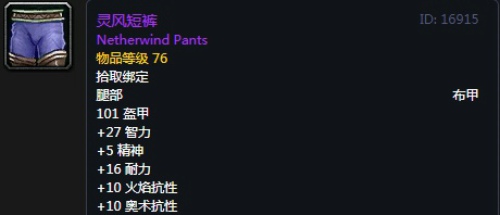 灵风短裤:腿部,出自熔火之心副本拉格纳罗斯掉落,推荐附魔专注秘药。