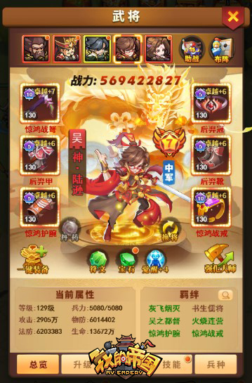 自古以来,便有“一夫当关万夫莫开”、“万马军中取敌上将首级,犹如探囊取物一般”这样豪迈句子来形容拥有强大武力的武将!而在《我的帝国》中又有哪一些武将,才具备如此生猛的潜力,进而成为我们追求的目标呢?在游戏初期,建议主公选择红将--陆逊做为主将,而随着游戏进程的推进,逐渐淘汰陆逊,尝试招募名将和神将。在武将系统中根据功能,可划分为两类主将类和辅助类。