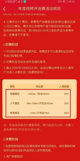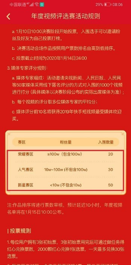 4.快手年度视频比赛分为三个比赛区,不同粉丝数量的在不同比赛区,一共分为初赛和决赛,每个赛区入围的数量不同。