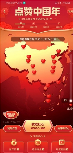 1.首先我们打开快手,进入页面之后,点击左上角的三条杠,之后点击点赞中国年。