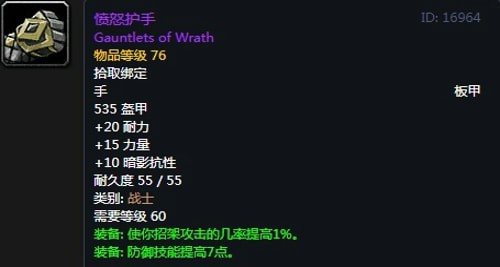 装备属性:535护甲,+15力量,+20耐力,+10暗影抗性,装备效果使你招架攻击的几率提高1%,防御技能提高7点。