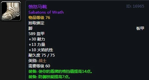 装备属性:+15火焰抗性,装备效果 使你招架攻击的几率提高1%。防御技能提高8点,每5秒恢复7点生命值。