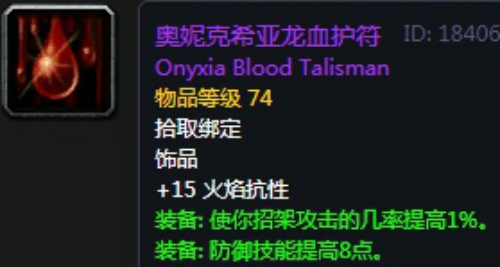 18、奥妮克希亚龙血护符,饰品2,奥妮克希亚龙头任务奖励装备,无法附魔。