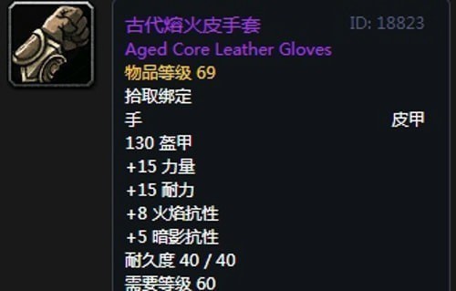 古代熔火皮手套:手套,出自熔火之心副本迦顿男爵,玛格曼达,焚化者古雷曼格,加尔均可掉落,推荐附魔强效敏捷。