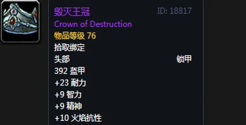 1、毁灭王冠:头部,出自熔火之心副本拉格纳罗斯掉落,推荐附魔次级奥术融合;