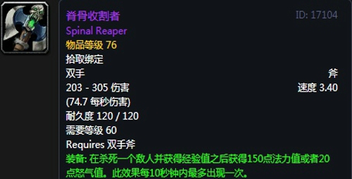 基础属性:203-305伤害,攻速3.40,无基础属性,装备效果 在杀死一个敌人并获得经验值之后获得150点法力值或者20点怒气值。此效果每10秒钟内最多出现一次,+34 攻击强度。