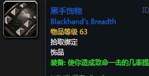 14、黑手饰物:饰品1,出自黑石塔任务掉落,联盟方可以击杀黑下最终BOSS时掉落信件接取任务,部落方则需要去荒芜之地找到军官高图斯接取任务。