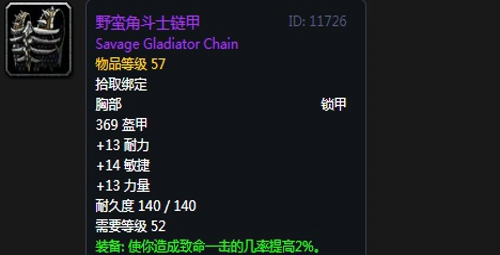 装备属性:369护甲,+13力量,+14敏捷,+13耐力,装备效果使你造成暴击的几率提高2%。